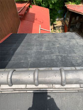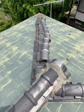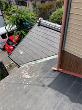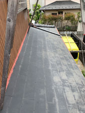 棟瓦を撤去した後、スレート瓦は年代的にアスベストが含有していて、高額な処分費がかかるため撤去はせず、