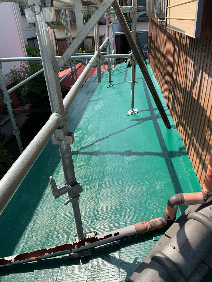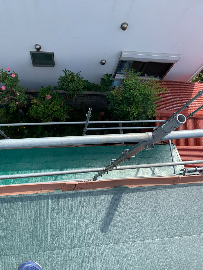 屋根の塗装のメンテを十数年行っておらず、屋根の素地に不安がありましたので、今回はアイジー工業のスーパーガルテクトをカバー工法にてオススメいたしました。