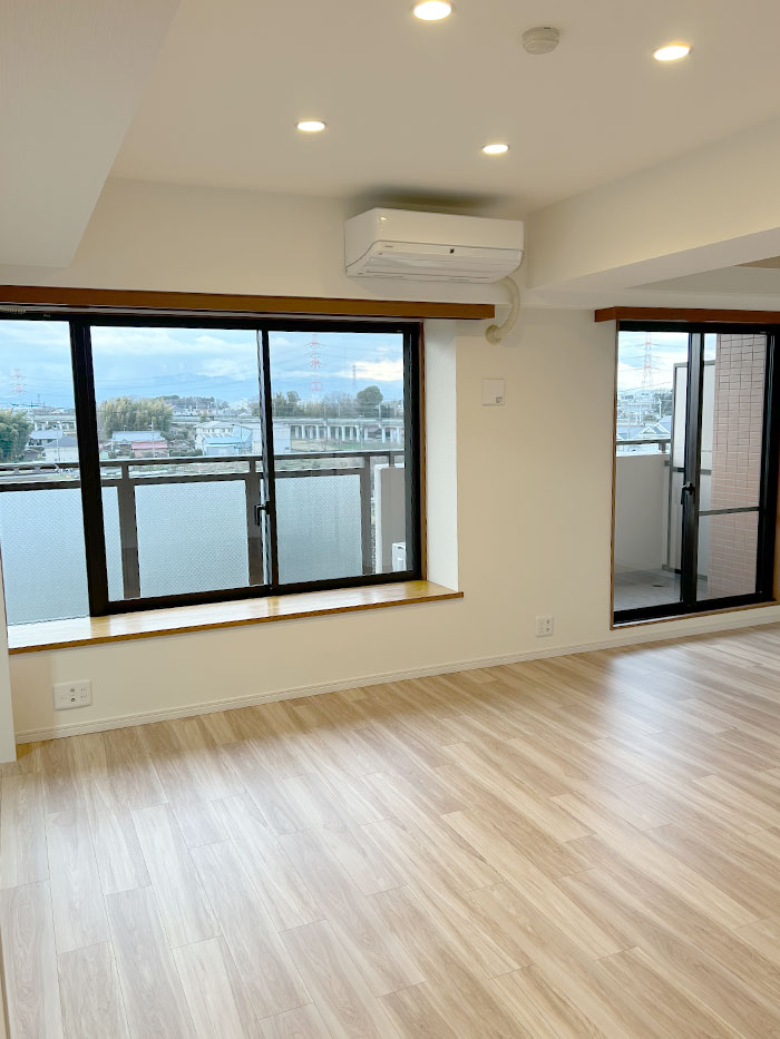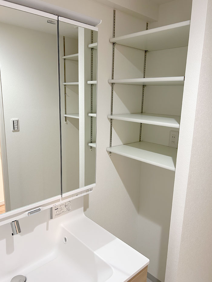 キッチン:クリナップ ラクエラ L型(色柄:ミストアッシュ柄) ユニットバス:LIXIL リノビオV(アクセント面:ランダムウッド) 洗面化粧台:LIXIL クレヴィ(色柄:ライトオーク柄) フローリング:DAIKEN MYオトユカフロア45Ⅱ(色柄:ペカン柄) 建具:Panasonic ベリティス(色柄:ホワイトアッシュ柄) |
